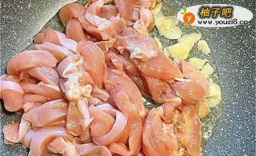 2油热放入蒜片和鸡胸肉,将鸡胸肉表面煎熟。