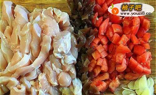 鸡胸肉切片、番茄切块、木耳随意切、蒜头切片。