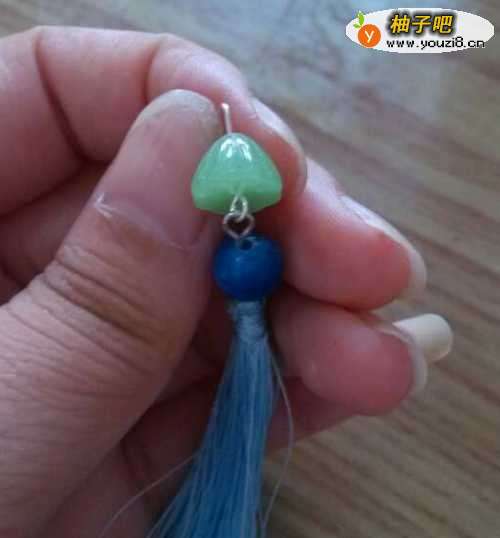 5然后用单圈挂上一截细链条,在流苏坠上用9针串颗珠子