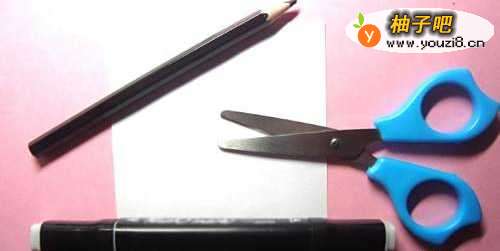 准备好,制作可爱的蚕宝宝儿童剪纸手工的材料和工具,有白纸、正方形卡纸、马克笔、铅笔,剪刀,如下图所示。