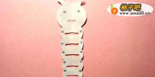6最后,用浅灰色的马克笔,在剪出的可爱的蚕宝宝图形上,涂颜色,注意颜色要涂均匀,并用灰色的马克笔给爱的蚕宝宝的斑点图形上涂颜色,这样一个可爱的蚕宝宝剪纸手工就制作好了,如下图所示。