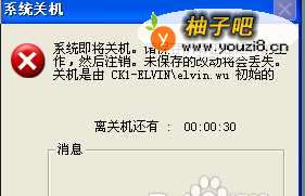 7用这个命令会弹出30秒钟的关机倒计时关机对话框: