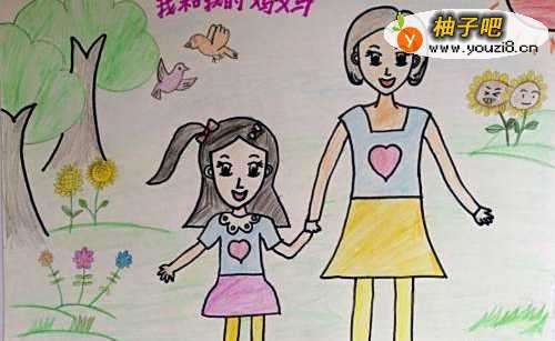 4如果绘画基础不好的孩子,可以画得简单一点,例如右上角画红红的太阳,左边画绿树和小鸟,中间画上我和妈妈。