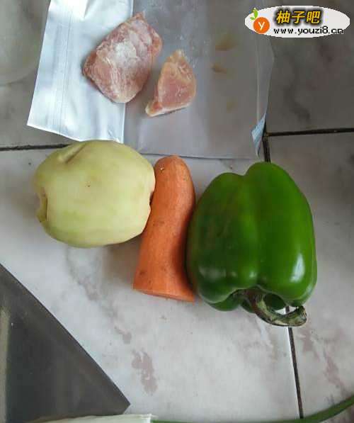 将土豆去皮、胡萝卜去皮和两端,青椒洗净。再准备一块肉和一根葱。