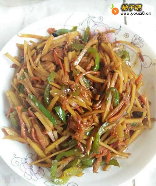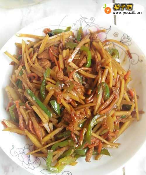 用土豆、胡萝卜、辣椒切成丝一起炒,颜色好看,又好吃。