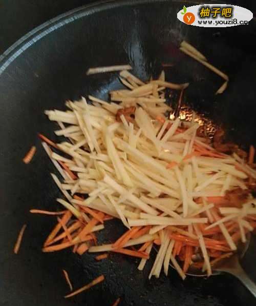 6先倒入胡萝卜丝,胡萝卜遇油,更易消化。