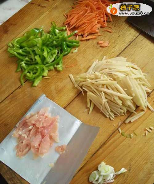 2将土豆、青椒、胡萝卜、肉和葱都切成丝。