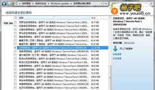 7找到日语语言包(KB2483139注意:所有语言包的更新补丁都是这个序列号)并勾选→确定。