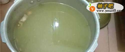 4将准备好的食材放入高压锅内,大火烧开,转小火20分钟(这样猪脊骨的营养都出来了,绿豆也变成绿豆沙了).