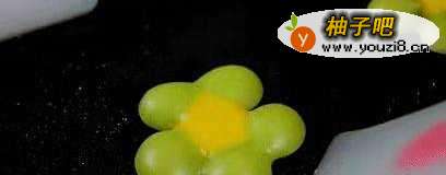 接着在蛋黄糊的四周,用菠菜糊继续挤5个均匀的圆圈,做成小花的形状。