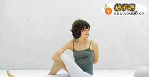 坐在瑜伽球上,两手臂向身体两侧伸展,然后调整呼吸,吸气,弯曲手臂,放在头部后方,身体向左侧扭动,达到最大限度,再向右侧扭动