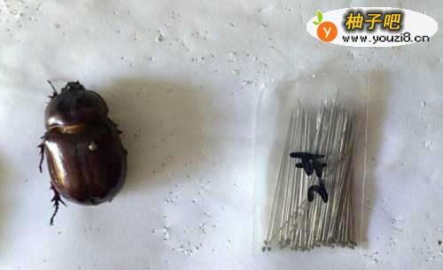 3固定昆虫标本用的昆虫针,系用不锈钢制成,由细至粗,共有00号、0号、1号、2号、3号、4号、5号等7个级别。 从0至5号,6个级别的针都带有针帽。只有00号不带针帽,其长度仅为其他各号针长的一半,是作为双重针插标本用的。本次用的是3#针,先固定昆虫。之前在泡沫表面钉了一层A4纸,解决塑料泡沫勾住跗节的问题。