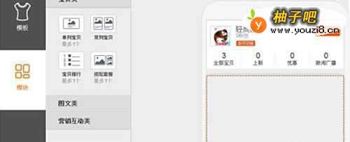 55.进入到这里,就到了我们要做的地方了,左边有二个,亲们,一个为模板,一个为模块,我们现在要做的是,模块页的,操作很简单,只要把模块中的宝贝类下面的展现方式用鼠标拖动到右侧虚线框中,松开鼠标就OK了,是不是很简单呢? 好了,你们也试试吧!