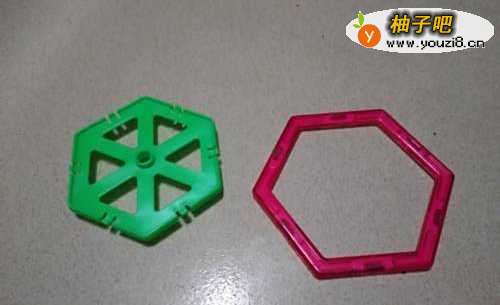 5第五步:然后在六边雪花轮子上放一个正方形磁铁片再放一个三角形磁铁片,依次把整个形状放置完整,如下图所示。