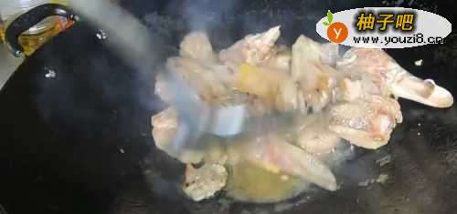 33.大火加热炒锅中的油至6 成热,投入姜片煸炒出香味,放入鸭块煸炒2分钟。