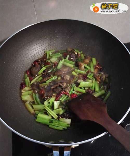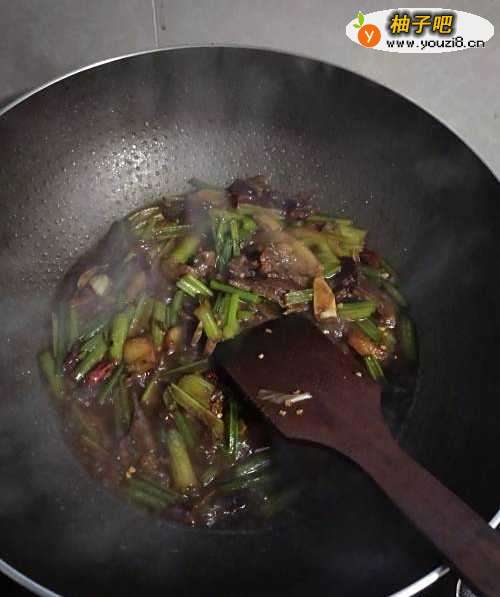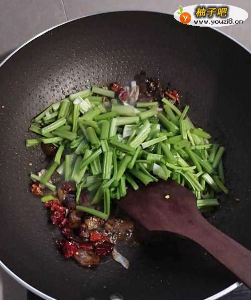 9如图,待芹菜熟透后放入适量鸡精后关火,盛入盘内即可食用。
