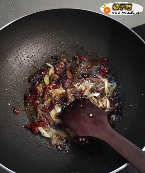 6如图,放入大葱、辣椒,用香醋炝一下。