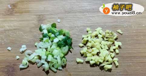 4再将小葱切成葱花,生姜剁成小丁,放在一起备用。