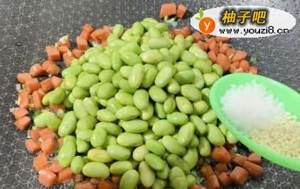 6放入豆粒,在放入食盐、鸡精、白糖进行调味,放入白糖能增加豆粒的鲜味。