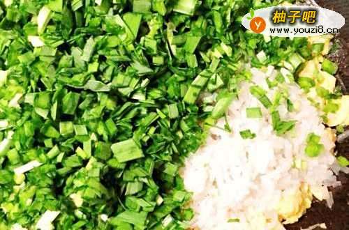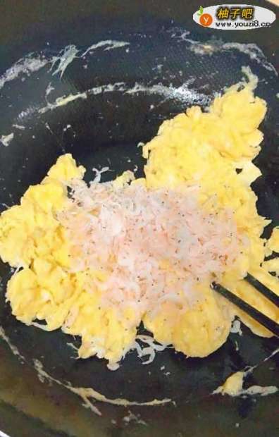 5鸡蛋成型后放入虾皮继续搅拌均匀,这个时候放盐(盐的量要混合韭菜后的味道为准,这个只能根据自己的经验了)