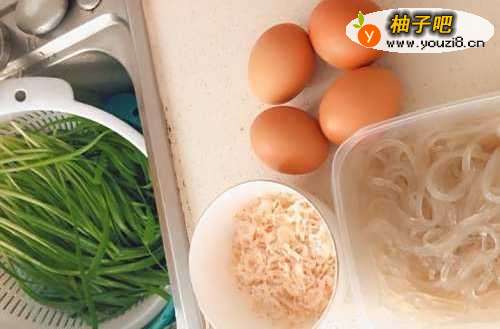 韭菜摘干净,洗好后控水,虾皮煮好的粉条,4个鸡蛋