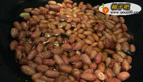 3再锅里面凉油凉花生米加热至听到噼噼啪啪的声音,关小火慢慢的咋制,
