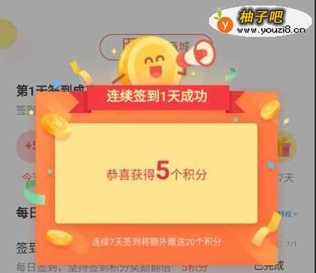 2此时,每天第一次进入中心后,会自动完成签到任务,提示获得5积分,如图,点击弹窗右上角叉号,关上即可。