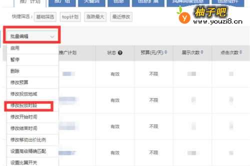 6第六步:在进行了页面设置操作后,点击“批量编辑“在“批量编辑“表单下找到“修改投放时段“,并点击该词条。如下图所示: