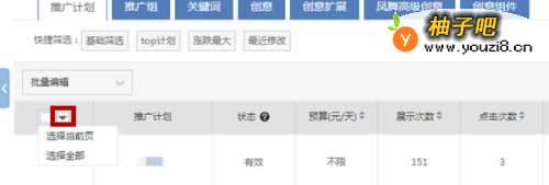 5第五步:在“推广计划“界面,我们需要进行页面设置的操作。这里有选择当前页和全部两种操作。可根据自己的需要来进行操作,点击“推广计划“下方的“实心倒三角“的图形,即可进行相关操作。如下图所示: