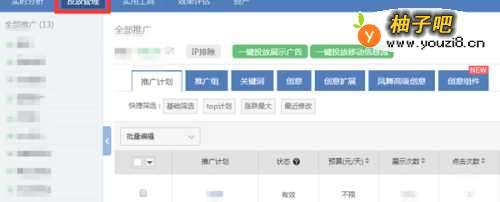 3第三步:点击“投放管理“,在进入”搜索推广”界面后,我们需要点击“投放管理“。如下图所示: