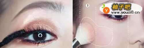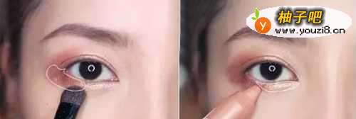 4眼妆部分先用眼影刷蘸取带珠光浅棕色眼影晕染上眼皮,然后余粉涂抹下眼睑。