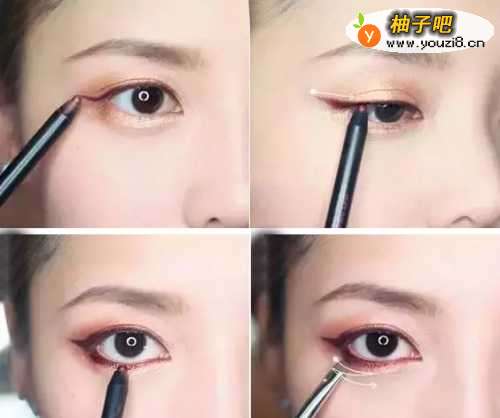 6眼线我们抛弃一贯用的黑色,选择棕红色的眼线笔画出全包围的上扬猫眼式眼线,然后用干净的眼影棒轻轻晕染下眼线。