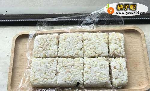 家里正好有没吃完的大米糙米饭,这时候不用放调料,直接用保鲜膜包好整出薄薄的方形,压紧。保持会儿,方便定型!