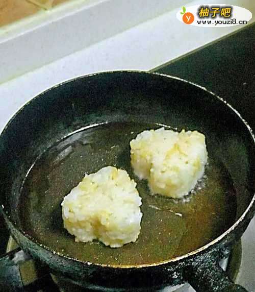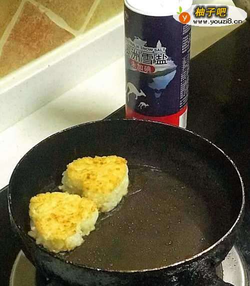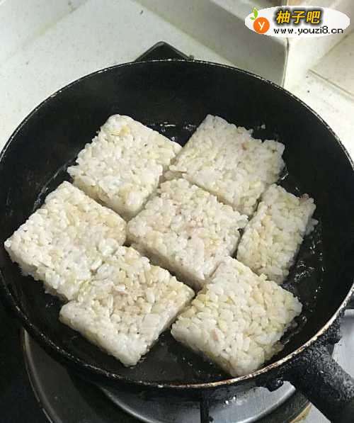 4平底锅中大火加油,放入米饭块,煎至一面金黄色翻面,继续煎另一面。若想要很脆可以多煎会。