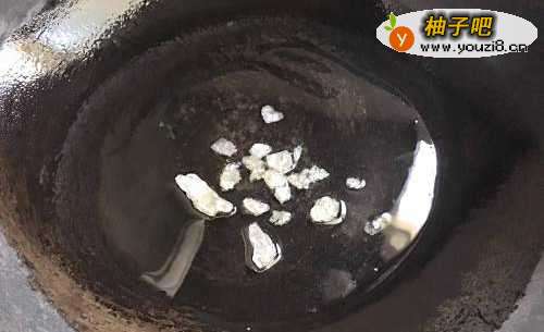 3接下来开火起锅,锅烧热之后加入少许油,撒入适量冰糖,开中火,用铲子慢慢搅拌,待冰糖融化呈现焦糖色即可。