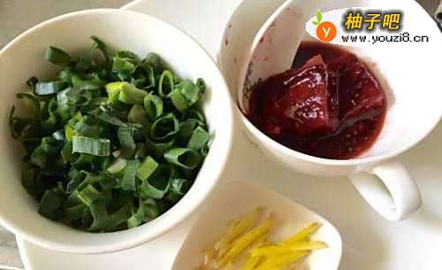2在焯水过程中可以将姜丝和葱花切好,取两块红腐乳加入适量冷水拌匀做成调味酱汁备用!