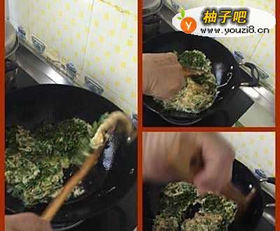 6用木质锅铲,抄底翻面,确保裹了鸡蛋的香椿芽都能接触到锅底的高温。