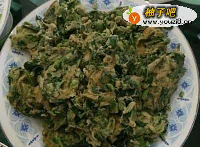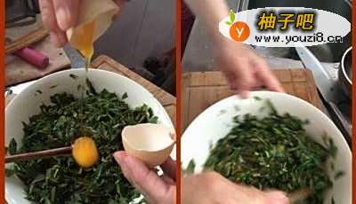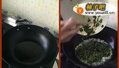 5开锅加油,食用油可多放入一些,以免鸡蛋发糊。待油温升高后,倒入香椿芽。