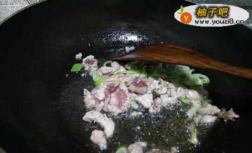 3锅中放油,加入葱花和猪肉翻炒,加少量食醋。