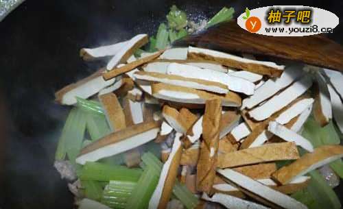 4肉差不多7分熟加焯水的芹菜段,翻炒1分钟。
