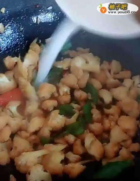 4炒香以后放花椰菜,放点酱油、蚝油,搅拌一下,再放青椒、胡萝卜。(胡萝卜青椒,事先准备好)