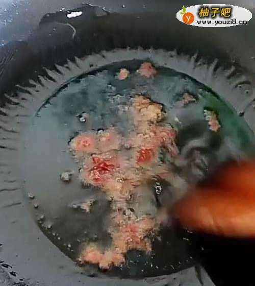 3起锅烧油,油温五成热时,放香辣酱炒开,再放大蒜炒香。