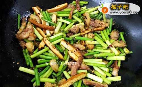 7蒜苔香干炒瘦肉就做好了,装盘。