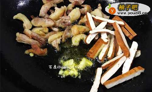 4瘦肉炒到四五成熟的时候,把姜末和香干一起放入锅里用大火炒1分钟。