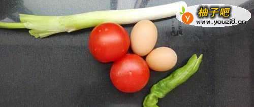 准备好食材,两个西红柿、两个鸡蛋、半根辣椒、半根葱