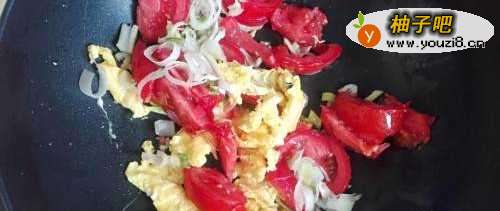 6把鸡蛋炒的快熟的时候,倒入切好的葱、辣椒和西红柿。