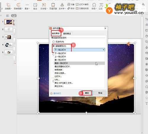 4在“动作设置”对话框中,选择【鼠标单击】选项卡,勾选【超链接】→【最后一张幻灯片】,点击【确定】即可;