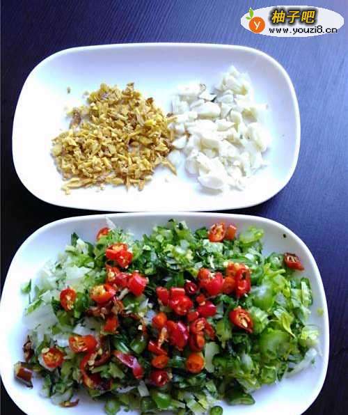 3姜蒜洗净剁碎;西芹,二荆条,小米辣洗净,切碎。