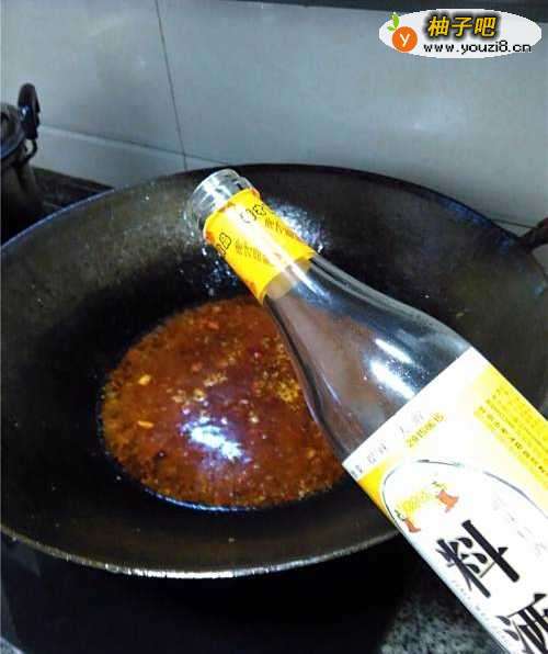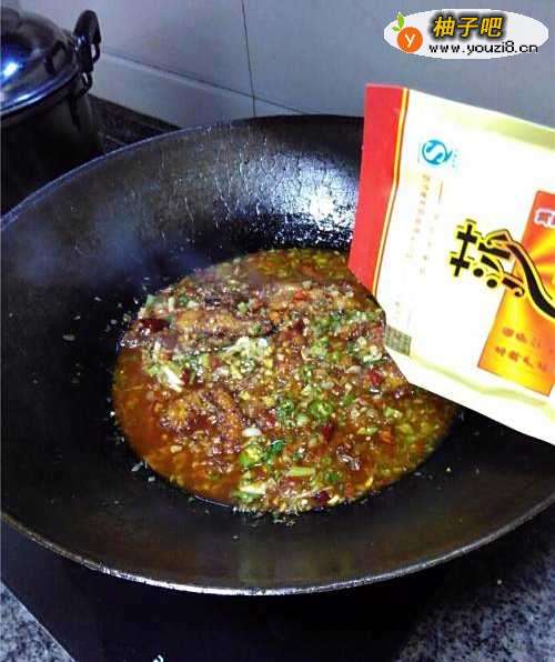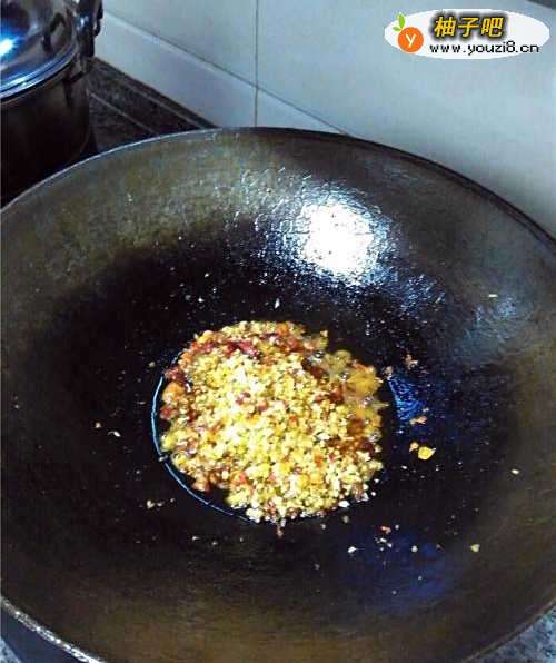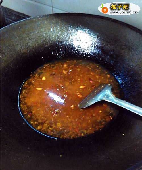 8炒锅里留底油,炒香豆瓣酱,放入干辣椒、花椒炒香,之后放入泡椒、泡菜、泡姜、姜末,蒜末碎炒香。