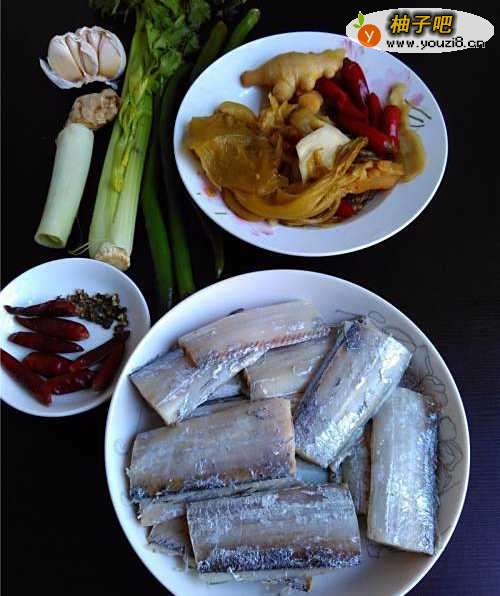 备好原材料:带鱼,泡菜,泡椒,泡姜,西芹,二荆条,大葱,老姜,大蒜,干辣椒,花椒。